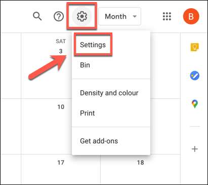 Per fare questo dal tuo browser web, apri il Sito web di Google Calendar. E fai clic sull'icona Impostazioni ingranaggi nell'angolo in alto a destra. Dal menu a discesa, fare clic sull'opzione "Impostazioni".