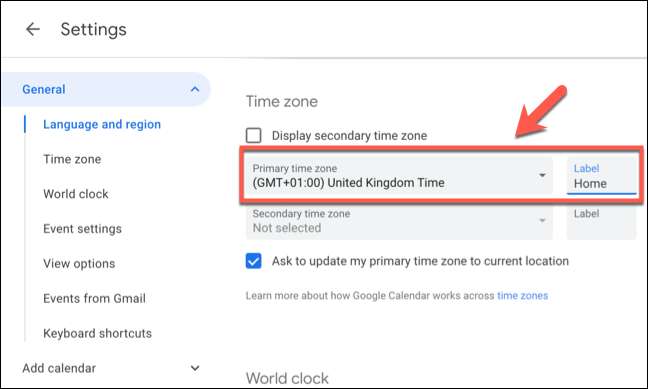 Sotto la categoria "fuso orario", è possibile impostare un nuovo fuso orario primario per il tuo account e impostare un'etichetta per questo (ad esempio, "lavoro" per un fuso orario che corrisponde ai tuoi colleghi). Seleziona un nuovo fuso orario dal menu a discesa "fuso orario primario", quindi scrivi una nuova etichetta nella casella di testo accanto ad essa.