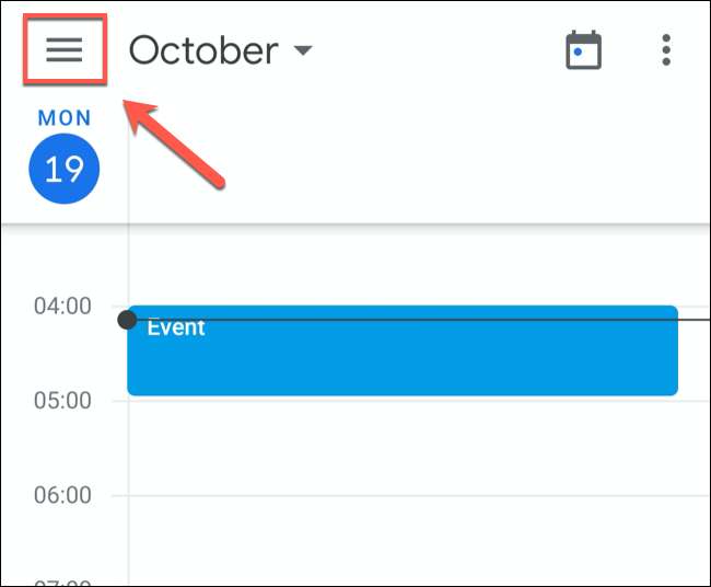 Per modificare il fuso orario primario, toccare l'icona del menu Hamburger nell'angolo in alto a sinistra dell'app Mobile Calendar Google.
