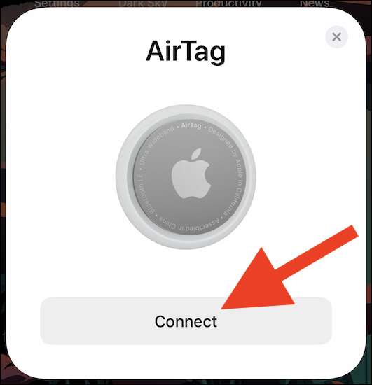 Successivamente, posiziona l'Airtag entro diversi centimetri del tuo iPhone sbloccato o in esecuzione iPad ios 14.5. , iPados 14.5 o superiore. Il telefono o il tuo tablet dovrebbe rilevare automaticamente il tracker Bluetooth. Quando il messaggio pop-up viene visualizzato sul dispositivo, tocca il pulsante "Connetti".