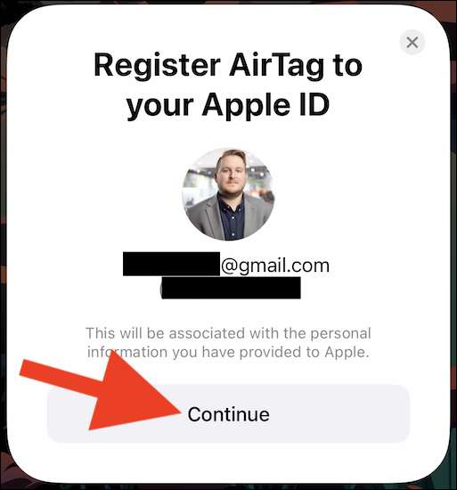 Tocca "Continua" per completare la registrazione dell'airtag sul tuo ID Apple.