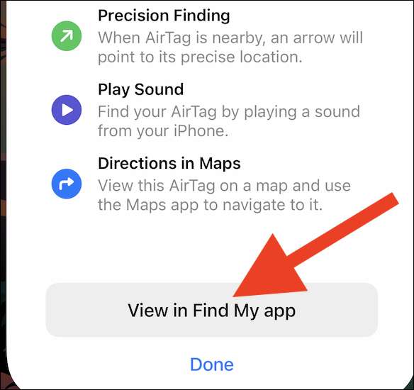L'Airtag è ora accoppiato al tuo iPhone o iPad e ha aggiunto alla ricerca della mia rete. Il nuovo messaggio spiega brevemente diversi modi per trovare l'accessorio se manca. Tocca la "Visualizza in Trova la mia app" per vedere l'Airtag in azione.