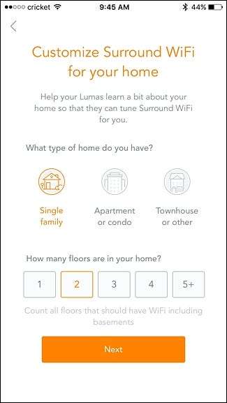 Quindi, seleziona il tipo di abitazione in cui vivi, seguito dal numero di piani, compresi gli scantinati (se vuoi il Wi-Fi lì). Tocca "Avanti" quando hai finito.