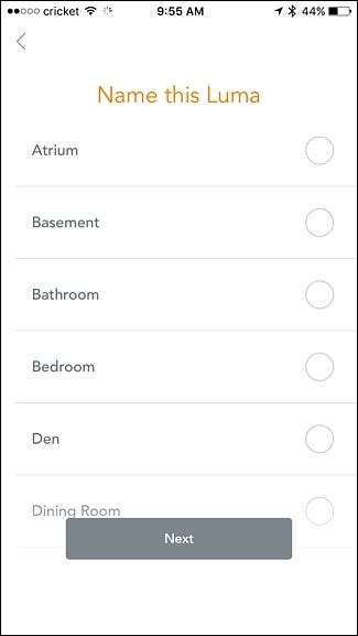 Premi "Avanti" nell'app fino a raggiungere la schermata "Dai un nome a questa Luna". Selezionare dove si trova questa unità e quindi toccare di nuovo "Avanti". Sfortunatamente, non puoi digitare un nome personalizzato per la stanza, quindi scegli il migliore se nessuno di loro si adatta.