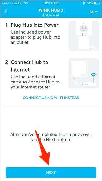 Premi "Avanti" poiché abbiamo già collegato il nostro Wink Hub, anche se è qui che puoi connettere il tuo Wink Hub al tuo Wi-Fi toccando "Connetti usando Wi-Fi invece".