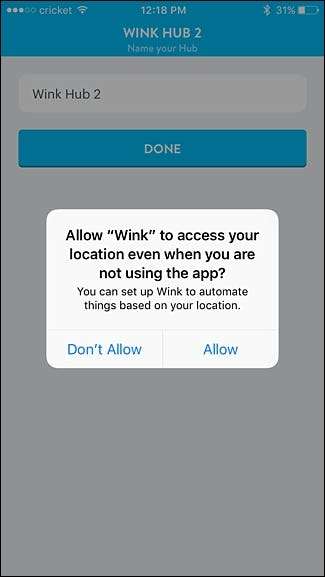 Dopodiché, consenti o nega all'hub Wink di utilizzare la tua posizione, che viene utilizzata per automatizzare i dispositivi in base allo stato di casa o fuori. Dopodiché, assegna al tuo Wink Hub un nome personalizzato, se lo desideri, quindi premi "Fine".