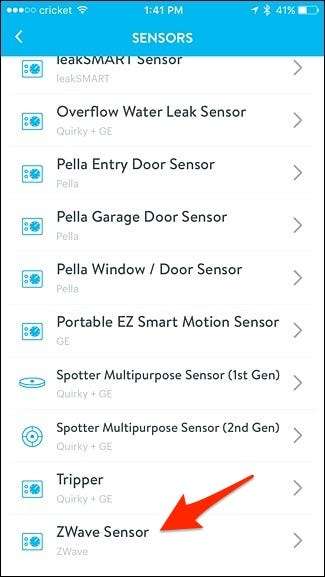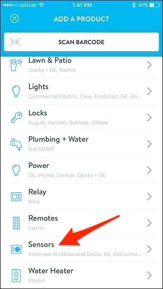 Dall'elenco di categorie tra cui puoi scegliere, seleziona quella che corrisponde al dispositivo che stai aggiungendo. Nel mio caso, sto aggiungendo un sensore di apertura / chiusura, quindi scorro verso il basso e tocca "Sensori".