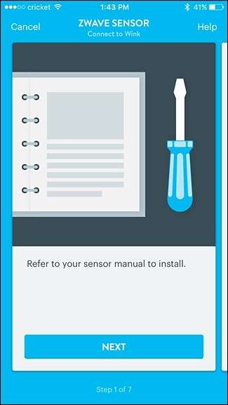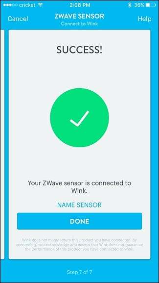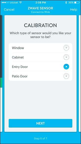 Quando l'hub è pronto per l'accoppiamento con il sensore, estrai la linguetta della batteria dal sensore e attendi che si accoppi con l'hub Wink. Quando si accoppia, l'app passerà alla schermata successiva in cui sceglierai dove posizionare il sensore nella tua casa. Premi "Avanti".