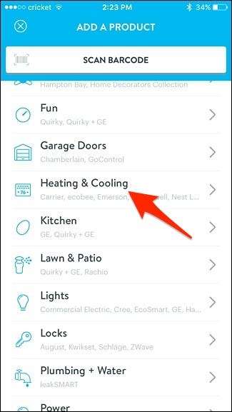 Se desideri semplicemente collegare un dispositivo smarthome esistente all'app Wink, puoi farlo dallo stesso menu "Aggiungi un prodotto". In questo caso, collegheremo un termostato intelligente Ecobee3 a Wink, quindi inizieremo selezionando "Riscaldamento e raffreddamento".