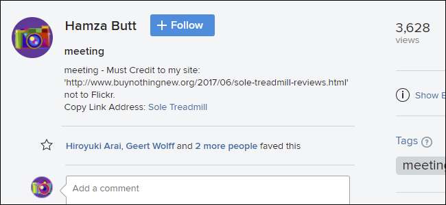 In secondo luogo, controlla i tag: per massimizzare la visibilità nella ricerca, gli spammer taggeranno queste foto nel modo più ampio possibile. Hamza Butt a volte include più di 20 tag sulle foto per questo motivo. Ora, ci sono molti fotografi legittimi che fanno la stessa cosa per lo stesso motivo, alta visibilità, quindi non prendere questo indicatore come prova immediata di intenti nefasti.