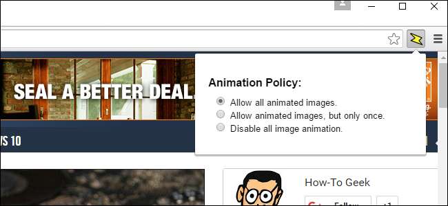 Per fortuna, Google fornisce la propria estensione ufficiale per il browser. Di nome Politica sull'animazione , questa estensione ti offre un pulsante della barra degli strumenti del browser che ti consente di controllare se le GIF animate vengono riprodotte. Puoi disabilitare completamente le animazioni o forzare la riproduzione delle GIF animate una sola volta prima di interrompersi. Dovrai aggiornare la pagina web corrente dopo aver modificato questa impostazione.