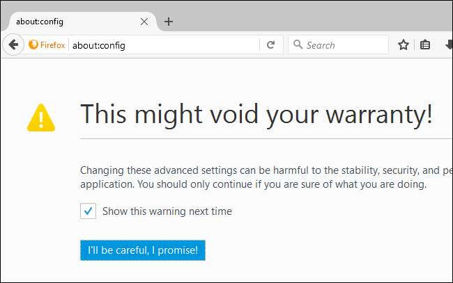 nella barra degli indirizzi di Firefox e premere Invio. Vedrai un avviso che ti dice di stare attento qui, poiché potresti modificare le impostazioni che non dovresti. Fai attenzione su questa schermata e non modificare le impostazioni a meno che tu non sappia cosa stai facendo. Fai clic su "Starò attento, lo prometto!" per accettare di aver compreso l'avvertimento.