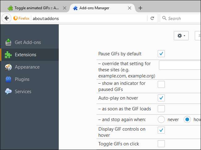 Dopo aver installato il componente aggiuntivo, vai al menu> Componenti aggiuntivi> Estensioni e fai clic sul pulsante "Opzioni" accanto a Attiva / disattiva GIF animate. Configura l'add-on per utilizzare le tue opzioni preferite. Ad esempio, puoi impostare le GIF animate come disabilitate per impostazione predefinita e farle riprodurre automaticamente quando passi il cursore del mouse su di esse.