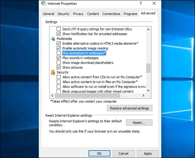 Fai clic sulla scheda "Avanzate", scorri verso il basso fino alla sezione "Multimedia" e deseleziona l'opzione "Riproduci animazioni nelle pagine Web". Dovrai riavviare il computer affinché questa impostazione abbia effetto, stranamente.