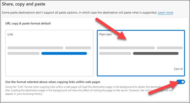 Quindi, per "URL copy & amp; Incolla il formato predefinito, "Seleziona l'opzione" Testo normale ". Per prendere un ulteriore passo avanti, disattivare l'accensione per "Utilizzare il formato selezionato sopra quando copia i collegamenti all'interno delle pagine Web".