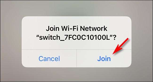 Dopo la scansione del codice, tocca "Iscriviti" nella notifica che chiede se desideri partecipare alla rete Wi-Fi locale del commutatore. Avrà un nome come "switch_8057c0001". Sembra un po 'spaventoso, ma non preoccuparti, ti stai collegando alla tua unità interruttore locale.
