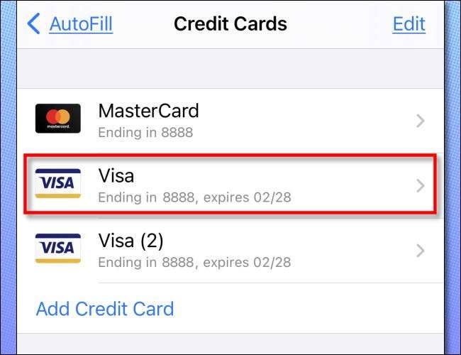 Quando richiesto, inserisci il PIN o convalidare la tua identità con Touch ID o ID Face. Successivamente, vedrai un elenco di carte di credito che Safari ha salvato in passato . Tocca qualsiasi voce nell'elenco per vedere più dettagli.