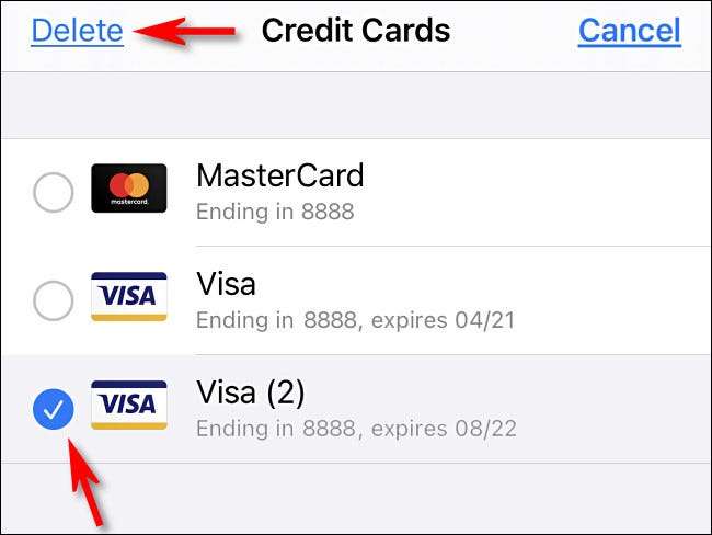 Se torni a una schermata per l'elenco delle carte di credito, è anche possibile aggiungere una carta di credito all'elenco toccando "Aggiungi carta di credito" e inserendo le informazioni, oppure è possibile eliminare una scheda dall'elenco toccando "Modifica", selezionando La carta con un segno di spunta e toccando "Elimina".