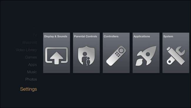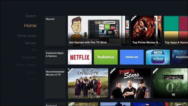 L'interfaccia di Amazon Fire TV Stick è identica all'interfaccia di Amazon Fire TV in quasi tutti i modi. La dashboard "Home" piastrellata evidenzia i media guardati di recente, app e giochi in primo piano e vari consigli proprio come su Fire TV.