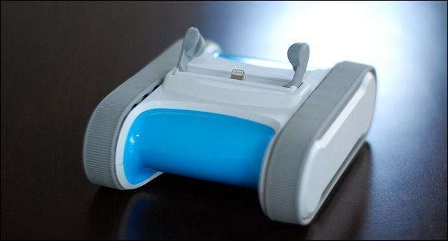 Ciò che ottieni effettivamente quando acquisti un Romo è una base alimentata a batteria simile a un carro armato in cui si aggancia il tuo iPhone o iPod Touch. Questa base funge da piattaforma mobile per il dispositivo iOS caricato con il software Romo che dà vita al tuo dispositivo iOS come un piccolo compagno robotico e stravagante.