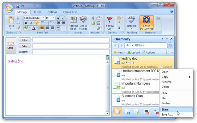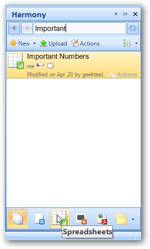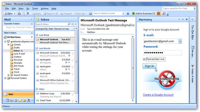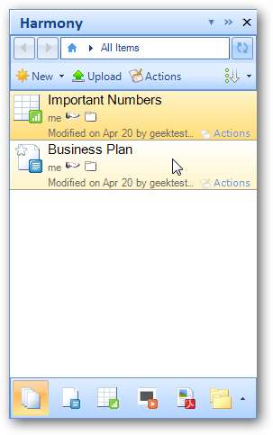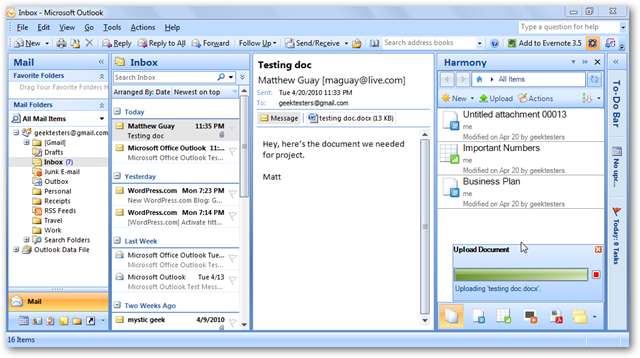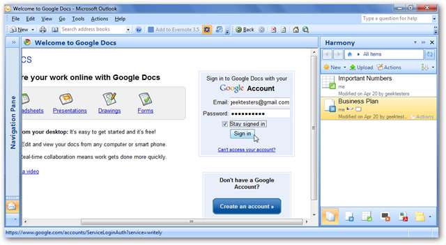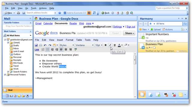 Harmony per Google Docs è un nuovo entusiasmante plug-in per Outlook 2007 (una versione per Outlook 2010 è in lavorazione). Ti consente di integrare il tuo account Google Docs con Outlook tramite una barra laterale. Da questo, puoi trovare uno qualsiasi dei tuoi documenti Google o caricare un nuovo documento, quindi puoi aprire il documento per visualizzarlo o modificarlo in Outlook.