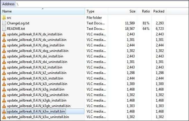 La parte importante del nome del file si trova dopo la parte 0.4.N. DX è per Kindle DX, DXi per Kindle DXi, K2 per Kindle 2 e K3 per Kindle 3. I suffissi per ciascuno indicano il tipo di Kindle che si trova all'interno di quel sottoinsieme. Il K3G, ad esempio, è il Kindle statunitense con servizio 3G, il K3GB è il Kindle del Regno Unito con servizio 3G, il K3W è solo Wi-Fi Kindle 3 e il K2i è l'edizione internazionale del Kindle 2. Inizia con la tua base modello e seleziona il file con il suffisso che corrisponde al tuo paese e alla connessione dati. Nel nostro caso eseguiremo il jailbreak di un Kindle 3 solo Wi-Fi, quindi scegliamo K3W_install.bin .