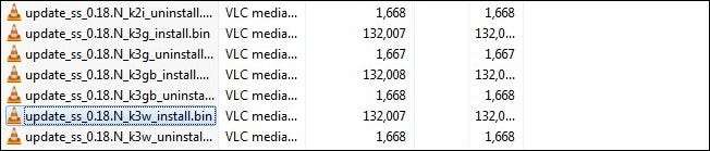 Il contenuto dell'archivio di hack del salvaschermo assomiglia quasi esattamente al contenuto dell'hack di jailbreak. Usa la stessa convenzione di denominazione che abbiamo usato per il jailbreak per individuare l'hack dello screensaver per il tuo dispositivo. Ancora una volta selezioneremo il file con il suffisso K3W_install.bin per andare con il nostro Wi-Fi solo Kindle 3.
