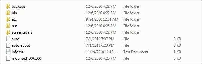 L'interno di / sinistra / la cartella assomiglia allo screenshot qui sopra. Le uniche aree di rilevanza per l'utente finale sono il / backup / e / screensaver / cartelle e il file autoreboot file. Se ci sono salvaschermi dal pacchetto salvaschermo predefinito a cui sei particolarmente affezionato, puoi recuperarli dal / backup / cartella: non ti prenderemo in giro per aver mantenuto lo screensaver di Jules Verne, è una bestia sexy. Se non desideri che nessuna delle immagini predefinite faccia parte del tuo nuovo pacchetto salvaschermo, puoi ignorare la cartella.