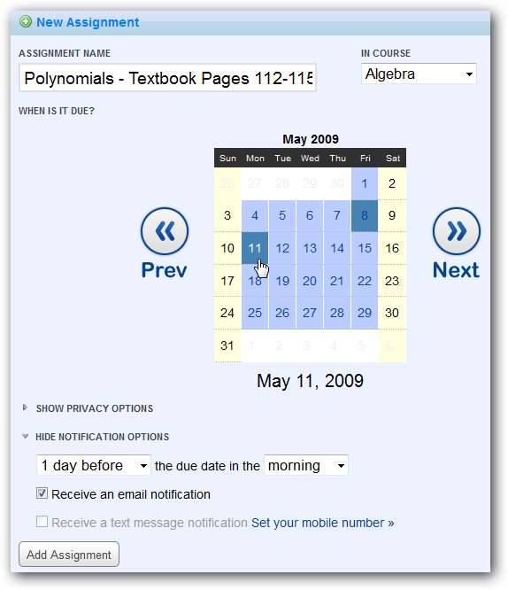 Anche la pianificazione degli incarichi è un processo semplice. Basta digitare il nome del compito, scegliere un corso, una data di scadenza, quindi come si desidera ricevere il promemoria.
