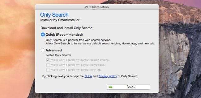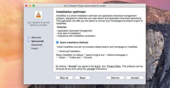 Quando un utente ignaro tenta di utilizzare uno di questi programmi di installazione, gli verrà presentata una schermata simile a questa ... che installa l'orrenda InstallMac che dirotta tutto e inserisce adware nel tuo sistema - è terribile. E, naturalmente, la schermata successiva cerca di farti installare qualcos'altro che non ti serve. E poi qualcos'altro. Sono così tanti crapware.