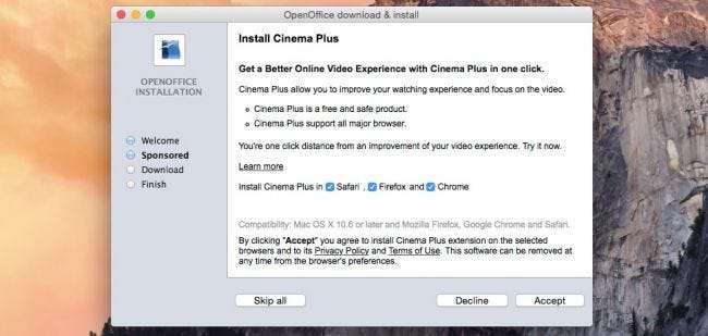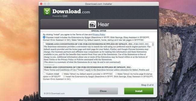 Proprio come su Windows, tu non c'è bisogno di guardare oltre CNET Downloads per trovare crapware in bundle ... anche per Mac. Esatto, sono diventati multipiattaforma con queste assurdità. E hanno peggiorato le cose, perché hai un pulsante Installa o un pulsante Chiudi. Non c'è nemmeno più un declino! Quando fai clic su Chiudi, il programma di installazione si chiude completamente. Quindi o hai in bundle crapware che dirotta il tuo browser, oppure non puoi installare quell'app.