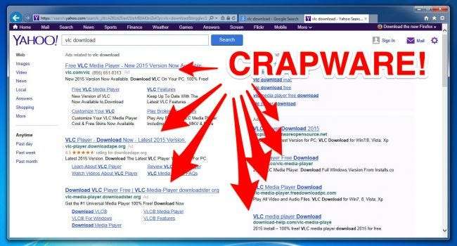 Il problema diventa molto, molto peggiore quando provi a cercare freeware usando il tuo motore di ricerca preferito. Vale la pena notare qui questo Google ha appena iniziato a tentare di vietare il crapware in bundle dai risultati e dagli annunci, ma purtroppo Yahoo e Bing non hanno lo stesso livello di fantastico. In effetti, sono semplicemente terribili.