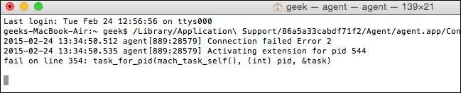 Una volta che il malware viene lanciato da OS X come daemon, utilizza una funzionalità poco conosciuta in OS X che consente a un processo di iniettarsi in un altro processo. Puoi vedere come funziona aprendo un terminale ed eseguendo direttamente l'eseguibile dell'agente. Quello che sta effettivamente succedendo è che si attaccherà al tuo browser web e si caricherà come un'estensione nascosta. Nello screenshot qui sotto puoi vedere che è stato attivato per l'ID di processo 544, che era Google Chrome. Farà lo stesso con Safari se è aperto.