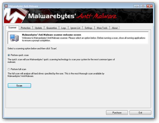 Quando avvii per la prima volta l'Anti-Malware di Malwarebytes, questa è la finestra che vedrai. Malwarebytes 'Anti-Malware ha un'interfaccia a schede molto carina per rendere il passaggio tra le funzioni fluido e veloce. A questo punto è impostato su "Esegui scansione rapida" come impostazione predefinita.