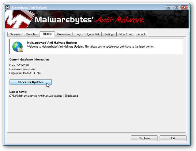 Se non hai controllato gli aggiornamenti durante il processo di installazione, ora è il momento giusto per farlo. Qui puoi vedere la versione corrente del database (e la data associata) insieme al numero di firme di malware che verranno scansionate. Gli aggiornamenti di solito vengono eseguiti tra 2,0 e 2,5 MB di dimensione. Fare clic su "Verifica aggiornamenti" per ottenere le firme del database più recenti.