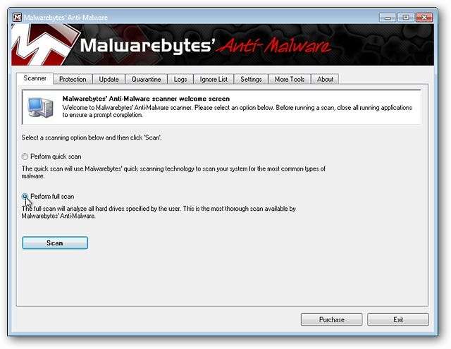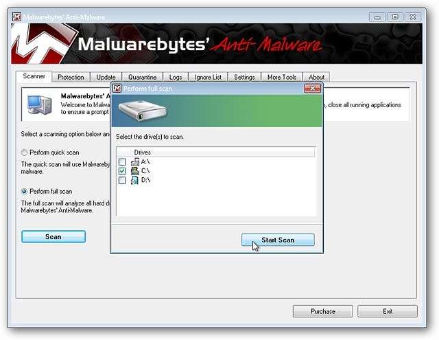 Una volta applicati tutti gli ultimi aggiornamenti, è il momento di avviare la scansione. Si consiglia di utilizzare l'impostazione "Esegui scansione completa". Fare clic su "Scansione" per iniziare.