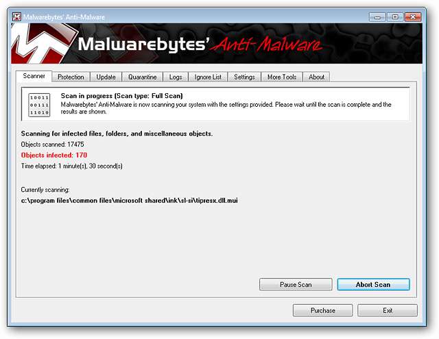 Puoi vedere come appare il processo di scansione qui. Malwarebytes 'Anti-Malware ha trovato 170 file infetti sul nostro sistema di esempio entro i primi 1,5 minuti ... ora è veloce! Puoi anche vedere esattamente dove e cosa sta attualmente analizzando Malwarebytes Anti-Malware.