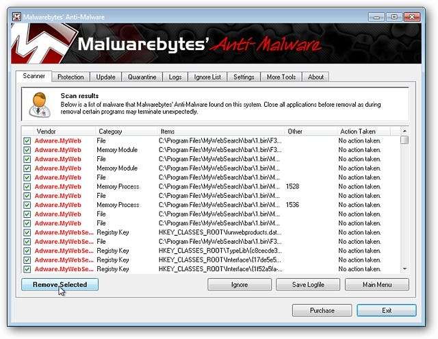 Dopo aver cliccato su "Mostra risultati", vedrai la seguente finestra con un elenco compilato di tutti gli oggetti malware trovati. È possibile visualizzare i nomi del malware, la categoria (ad esempio file, processo di memoria, chiave di registro, ecc.) E la posizione sul sistema. Si noti che per il momento è elencato "Nessuna azione intrapresa" per tutto. Ciò consente di verificare la presenza di eventuali falsi positivi che potrebbero essersi verificati. Dopo aver esaminato l'elenco e verificato gli elementi di cui si desidera occuparsi, fare clic su "Rimuovi selezionati" per rimuovere il malware dal sistema.