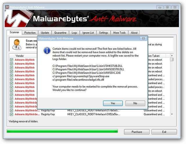 Se ci sono problemi di malware che devono essere rimossi durante un riavvio, vedrai il seguente messaggio che descrive esattamente cosa sarà risolto non appena riavvii il computer. La rimozione degli elementi durante un riavvio è estremamente semplice e veloce ... nel nostro sistema di esempio il "processo di riavvio della pulizia" sembrava esattamente come un normale riavvio ( Eccezionale! ). Fare clic su "Sì" per avviare il processo di riavvio.