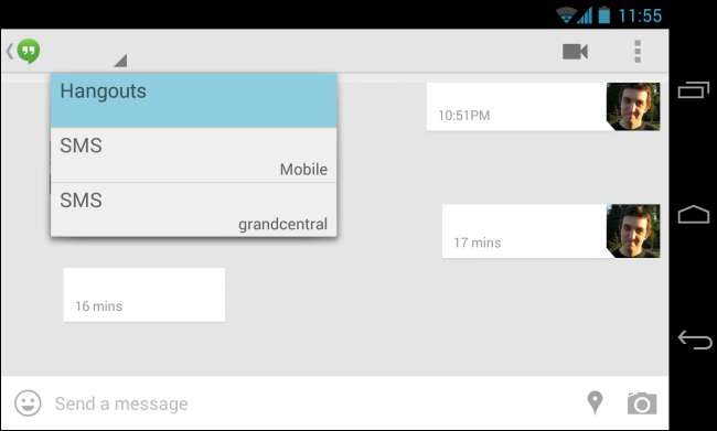 Su Android 4.4, Hangouts si registra come "provider di SMS". Qualsiasi altra app per SMS può anche scegliere di registrarsi come provider di SMS, diventando l'app di messaggistica predefinita. Qualsiasi app può ascoltare i messaggi SMS in arrivo, ma solo una singola app, l'app SMS predefinita dell'utente, può inviare messaggi SMS.