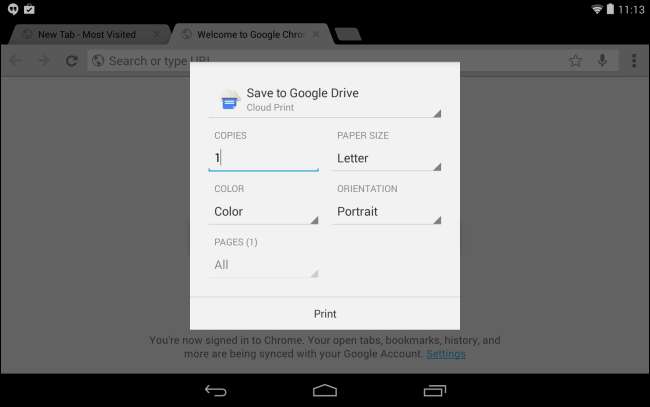 Troverai una nuova opzione di stampa nella schermata Impostazioni di Android e molte app integrate supportano la stampa. Ad esempio, puoi toccare il pulsante del menu in Chrome e toccare l'opzione Stampa nel menu per stampare una pagina web.