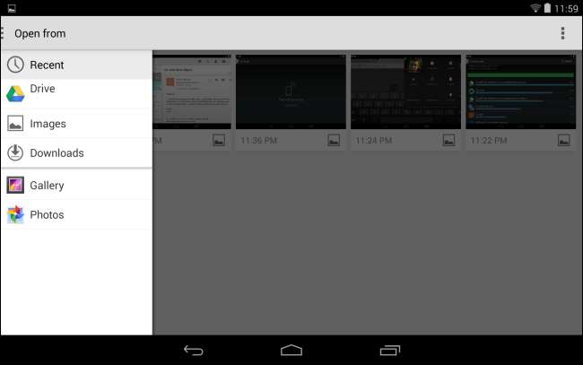 KitKat include un nuovo modo per cercare e selezionare i file. Questo selettore di file supporta sia l'archiviazione locale, su dispositivo che i servizi di archiviazione cloud come Google Drive. Tuttavia, qualsiasi servizio di archiviazione cloud può integrarsi con esso. Il supporto per Box è già offerto, mentre altri servizi di cloud storage come Dropbox o SkyDrive potrebbero implementare un "fornitore di documenti" e apparire in questo elenco. Ogni volta che utilizzi il selettore di file, sarai in grado di scegliere un file da qualsiasi origine locale o servizio di archiviazione cloud.