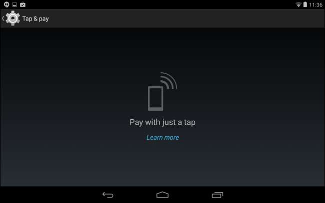 KitKat include un'opzione "Tocca e paga" nella schermata Impostazioni. Grazie all '"emulazione della carta host", qualsiasi app su Android può ora emulare una smart card NFC. A breve termine, ciò significa che qualsiasi dispositivo con estensione NFC dovrebbe essere in grado di utilizzare l'app Google Wallet. A lungo termine, ciò significa che esiste un modo integrato per varie app, come app per carte fedeltà e portafogli digitali concorrenti, per lavorare con i terminali POS NFC.