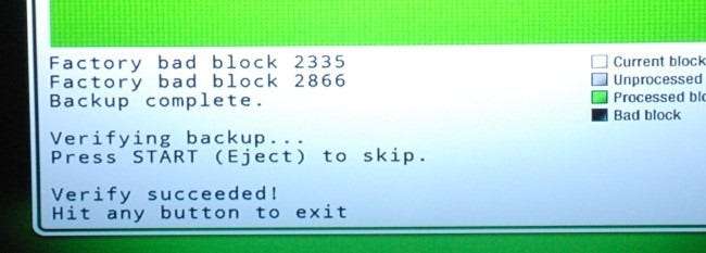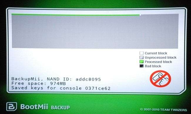 Se noti il messaggio "Factory bad block" quando torni, niente panico. È normale che ci siano blocchi danneggiati nella NAND. Un backup NAND con un errore di blocco posteriore funzionerà perfettamente per un ripristino successivo. Quando il backup è completo, esci da BootMii.