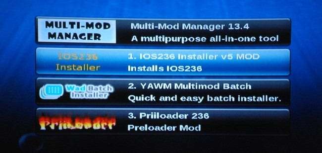 Se la tua cartella / WAD / è vuota , salvo per i file WAD che abbiamo estratto all'inizio di questo tutorial, seleziona il batch YAWM Multimod. Installerà automaticamente tutti i file WAD in / WAD / directory e quindi tornare al menu Homebrew Channel.