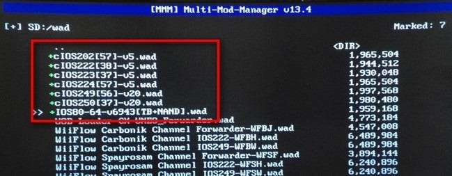 Se stai installando selettivamente i file WAD, seleziona il menu WAD da Multi-Mod Manager e usa il tasto + sul tuo Wiimote per selezionare tutti i file cIOS e i file WAD IOS80. Premi A per installarli in blocco. Torna all'Homebrew Channel.