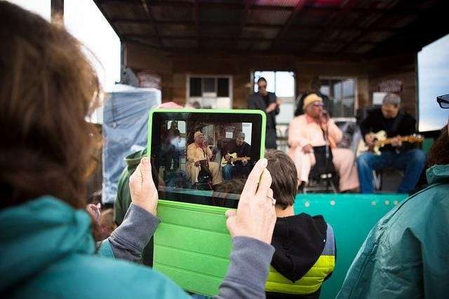 La maggior parte delle persone non dovrebbe scattare foto con i tablet, se non altro perché i tablet offrono una qualità fotografica peggiore rispetto agli smartphone comparabili. Il tuo smartphone è una fotocamera migliore, quindi tiralo fuori. Nella folla, le persone nelle vicinanze apprezzeranno che non blocchi le loro visualizzazioni con il tuo schermo più grande.