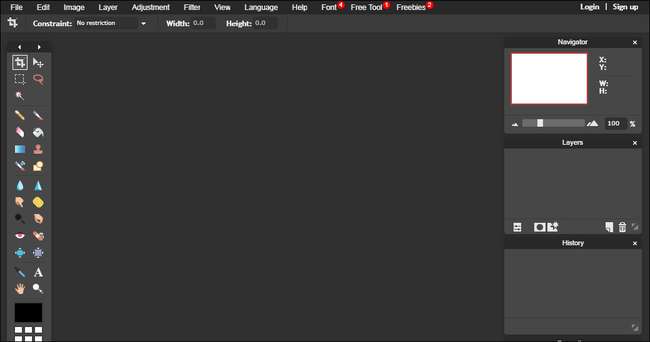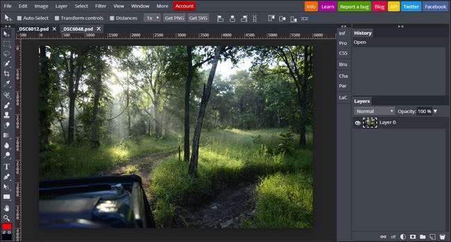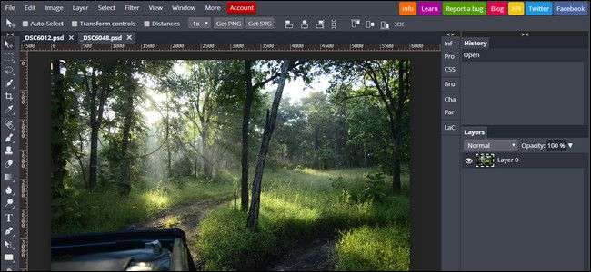 Photopea è un potente editor di foto online diverso da qualsiasi altro editor in questo elenco. È progettato per essere un sostituto completo di Photoshop in esecuzione nel tuo browser. In effetti, puoi persino caricare un file PSD, XCF, Sketch, SVG o qualsiasi altro file immagine per iniziare la modifica.