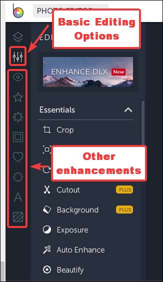 Ma è qui che finisce la somiglianza di BeFunky con altri editori. Come puoi vedere nell'immagine qui sotto, le opzioni di modifica in BeFunky si inclinano maggiormente verso l'estremità decorativa mentre le opzioni di modifica di base sono tutte inserite in un'unica scheda.