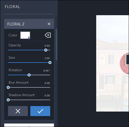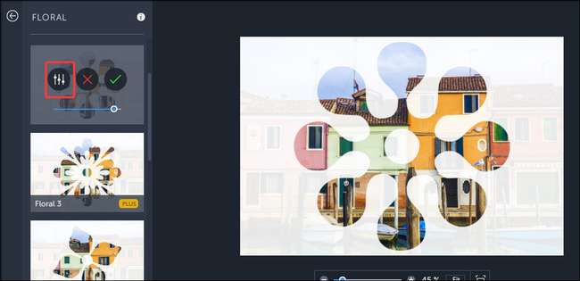 Una caratteristica interessante di BeFunky è che puoi variare il grado di applicazione della maggior parte degli effetti. Ad esempio, se scegli un effetto Sovrapposizione floreale, puoi personalizzare la sovrapposizione facendo clic sull'icona dell'equalizzatore.